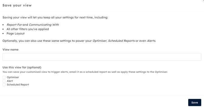 You can save your customised view to trigger alerts, email it as a scheduled report as well as apply these settings to the Optimiser.